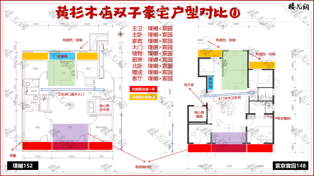 璞樾优于紫京宸园的地方:电视墙更长、家政间独立、大门不冲卫生间、主卧有侧窗户、客厅面宽更大。
