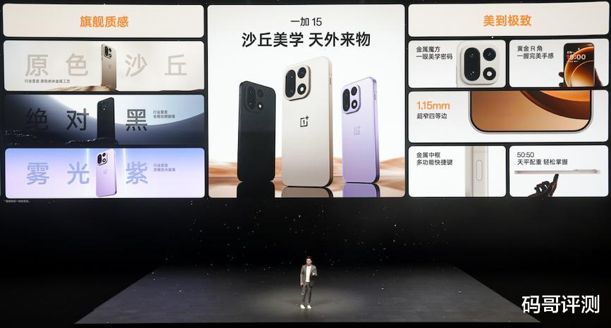 一加 15 带来「原色沙丘」、「绝对黑」和「雾光紫」三款配色。「原色沙丘」将沙漠的恢宏大气浓缩于方寸之间,配合微弧氧化工艺带来的独特淬炼纹,诠释了一加对美感与质感的追求。