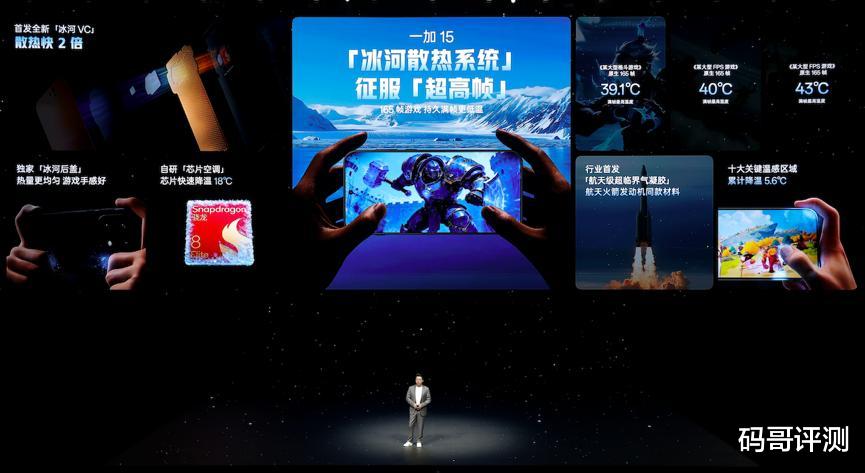 Ultra 级的性能释放,需要强大散热系统的保驾护航。一加 15 搭载全新「冰河散热系统」,采用行业领先的技术理念,在保证了大散热面积的基础上,还带来了更大的散热空间。在独家自研「芯片空调架构」下,一加 15 带来大面积「冰河 VC」,并通过手撕钢结构,减少了 VC 厚度,从而腾出更大的散热空间,实现芯片核心区域降温 18℃,为长时间高负载游戏带来更稳定的帧率表现。此外,一加 15 还创新搭载「游戏手」模型,基于玩家握持姿势,进行针对性的散热与隔热设计,即便面对高负荷游戏场景,一加 15 也能带来“十指战区,持久冰凉”的舒适握持体验。