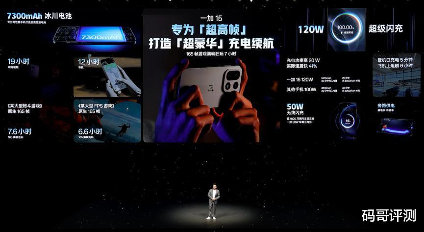 一加 15 搭载专为高性能手机打造的 7300mAh 超大「冰川电池」,配合 120W 超级闪充,带来旗舰档位手机中最豪华的充电续航组合。一加 15 所搭载的电池采用新一代仿生硅碳材料与双电芯结构,能量密度高达 814Wh/L,足以支撑全天候续航需求。一加 15 支持行业领先的 120W 有线闪充,同时还配备 50W 无线闪充,为用户带来更加灵活的充电选择。针对游戏场景,一加 15 带来行业首发「局间补电」技术,还搭载行业领先的「旁路供电」功能,确保玩家在长时间对战中也能保持满血状态。