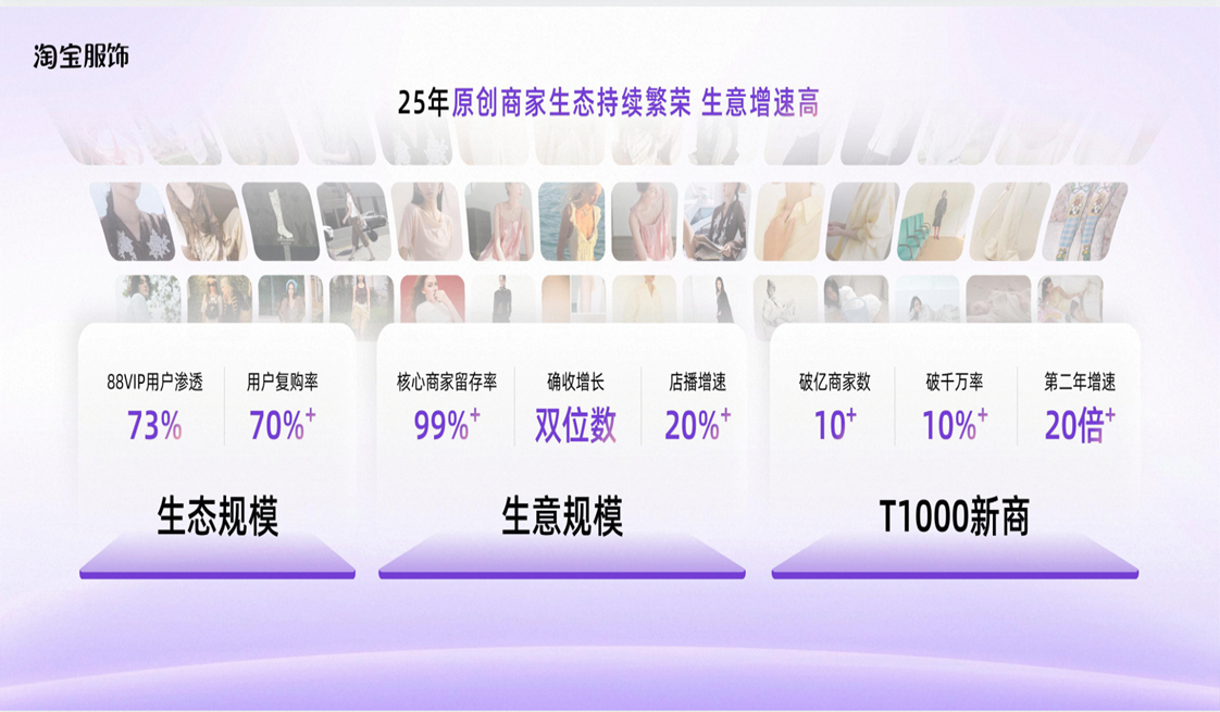 淘宝服饰过去一年的成绩单也足够亮眼:在核心商家的生意大盘中,88VIP用户渗透达到73%,用户复购率保持在70%以上。这表明高净值用户依然愿意在淘宝买衣服,且粘性极强。因此,核心商家在淘宝的留存率高达99%,远超其他平台。