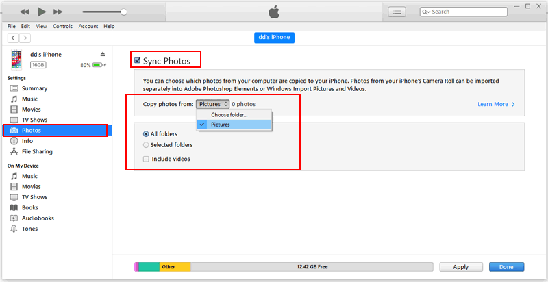 勾选同步照片选项,选择要同步的文件夹或应用