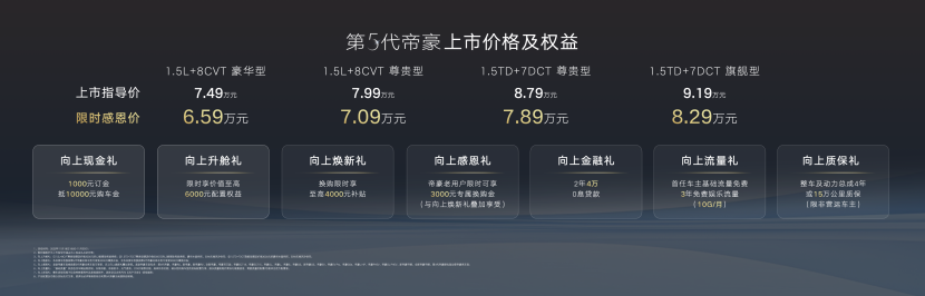 感恩400万,荣耀新篇章。第5代帝豪即日起推出7重上市礼遇,2025年11月30日前购车用户,可享包含1000元订金抵10000元购车金的向上现金礼;限时享价值至高6000元配置权益的向上升舱礼;换购限时享至高4000元补贴的向上焕新礼;帝豪老用户可享3000元专属换购金的向上感恩礼(与向上焕新礼叠加享受);2年4万0息贷款的向上金融礼;首任车主基础流量免费,3年免费娱乐流量(10G/月)的向上流量礼;整车及动力总成4年或15万公里质保(限非营运车主)的向上质保礼。除此之外,作为帝豪持续越级向上,给用户带来超越期待体验精神的延续,用户还可选装千里浩瀚辅助驾驶H3方案。第5代帝豪首次将包含行车、泊车、安全三大维度的高阶辅助驾驶系统带入8万级燃油车型,拥有最高支持120km/h刹停的AEB急刹避险功能和同级唯一AES主动紧急避让功能,为用户提供“沃尔沃”式安全感,真正做到“科技平权、油电同智”