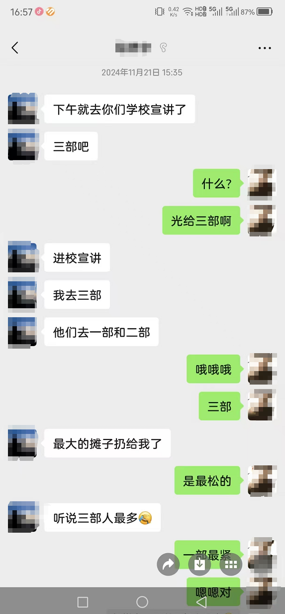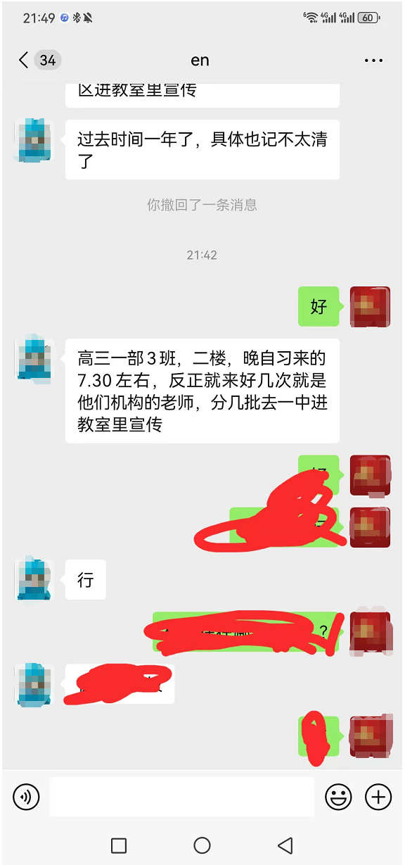 第三,教育局关于“公司人员偷偷进校”的说法不合逻辑,校外人员违规进校开会问题未被正视。鑫城教育公司人员并非简单进入校园,而是直接在1号楼2楼东边第2个教室给学生开会宣传,甚至还为学生购买饮料拉拢人心。我们严重质疑:学校管理本应严格,校外人员如何能“偷偷”进入教学区域?更如何能直接占用教室、在课堂时段组织学生开会?若真是“偷偷进入”,为何全程未被学校安保人员、值班老师发现和制止?教育局仅以“偷偷进入”一笔带过,完全回避了学校管理存在的漏洞,这种敷衍的调查结果无法让我们信服。