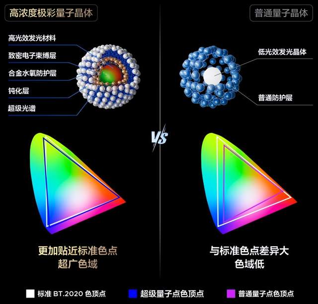 首先,量子点层的稳定性解决了色衰问题。相较于 RGB-Mini LED 的红色芯片衰减,量子点材料的发光特性更稳定。其次,超级蝶翼华曜屏与晶粹色阻的配合,实现了光线的精准调控。不同于 RGB-Mini LED 需要长距离混光导致的光线溢散,SQD-Mini LED 的混光距离更短,光线从量子点层直接投射到屏幕,避免了串色问题,白光纯净度提升 30% 以上。最后,量子点的超级光谱和屏幕的穿透光谱完美匹配,实现100% BT.2020 的全局覆盖,意味着无论观看纪录片、电影还是游戏画面,色域值始终维持在理论极限,彻底告别 “场景依赖” 的色彩波动。