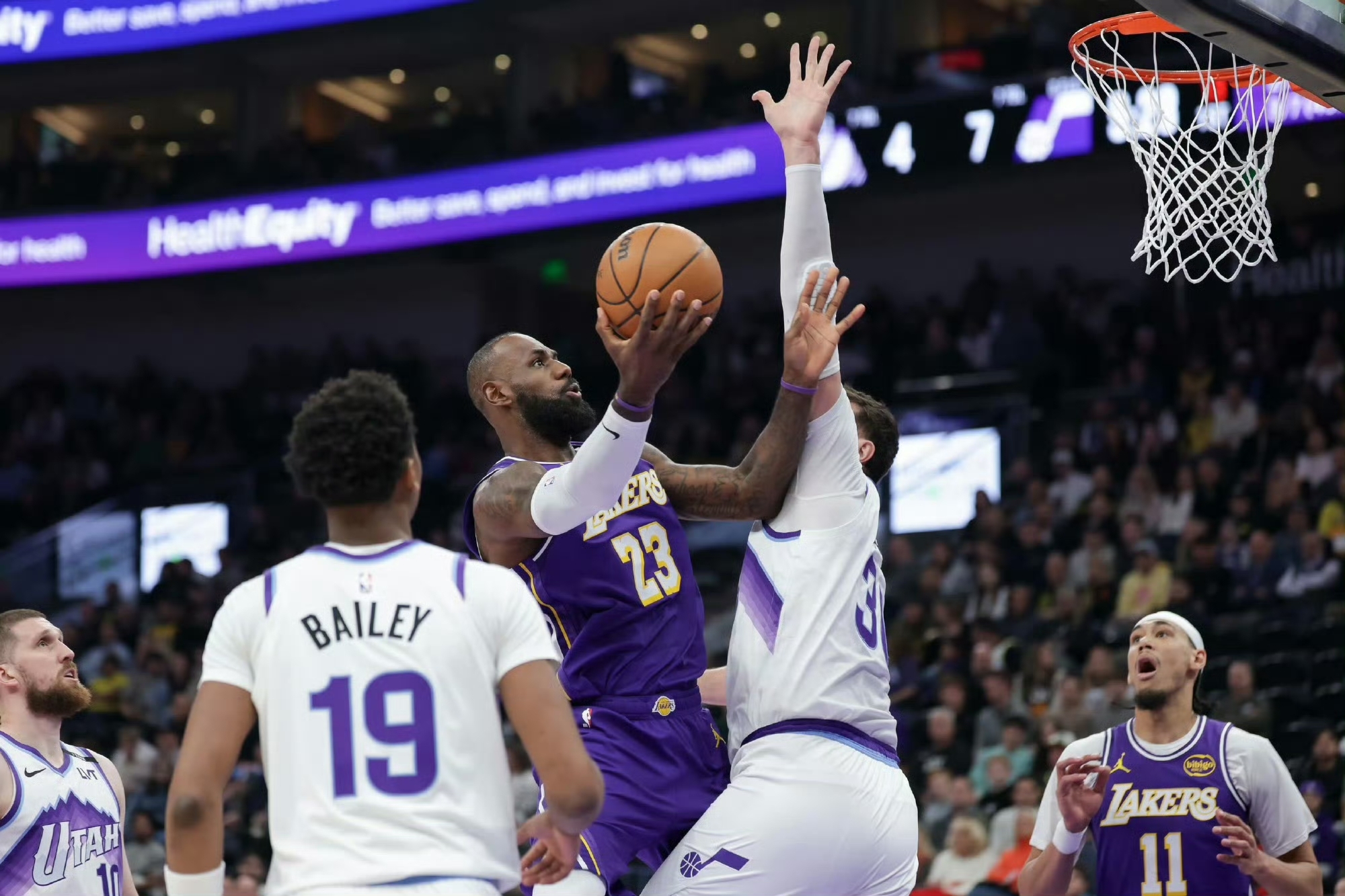 看上去依旧空间狭小,但真的能摁住爵士的年轻快腿。詹姆斯内突外投、克莱贝尔连续冲框老夫聊发少年狂获得罚球,湖人用最简单直接的方式将比分反超。
