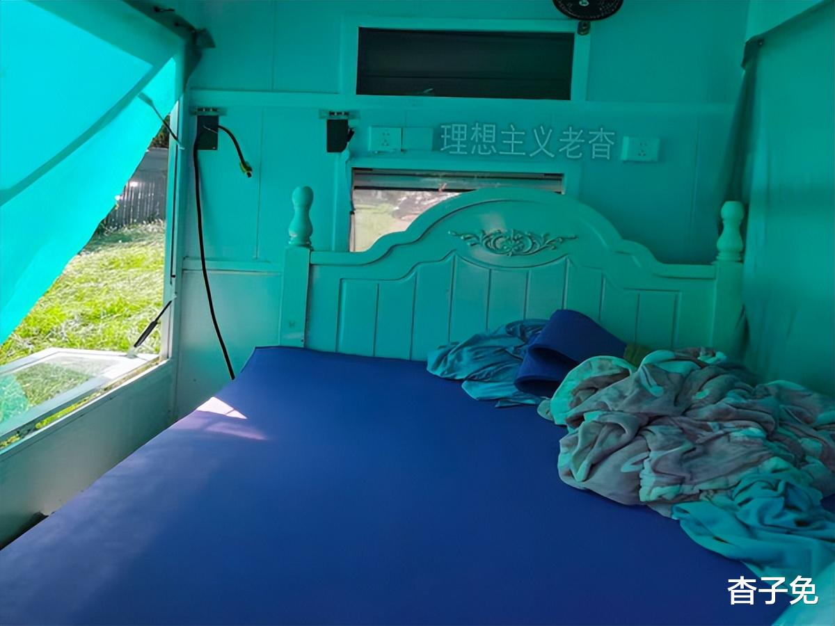 房箱玻璃窗太透明了,适合用来摆摊,不适合用来旅行,于是车主在室内挂上了蓝色布帘,既遮阳又保护隐私。