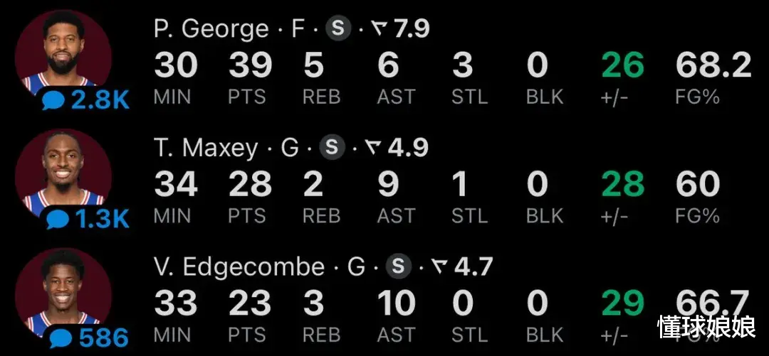 哦,对了,这是乔治复出的第4场比赛,这4场,76人战绩3胜1负。
