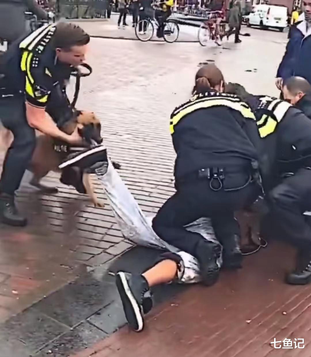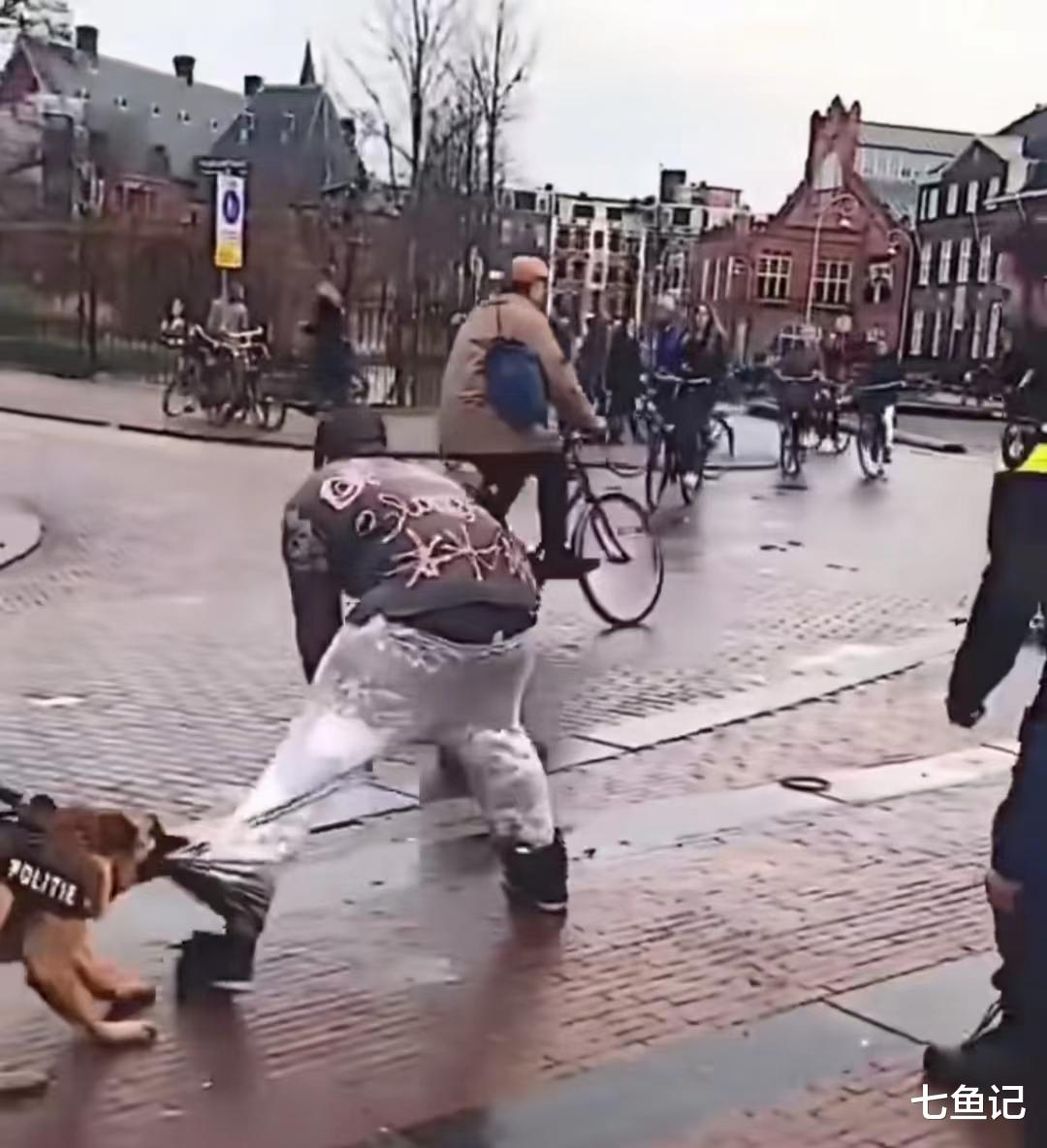 警察都已经死死地拉着牵引绳,把警犬拉开了,他还追上去继续对着警犬大喊大叫,让一旁的警察恨不得揍他。