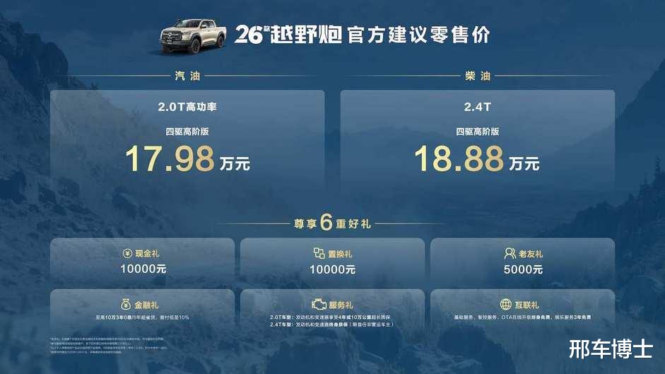 2026款商用炮,基于坦克平台打造,是同级动力最强、性价比最高、最成熟可靠的冠军皮卡。