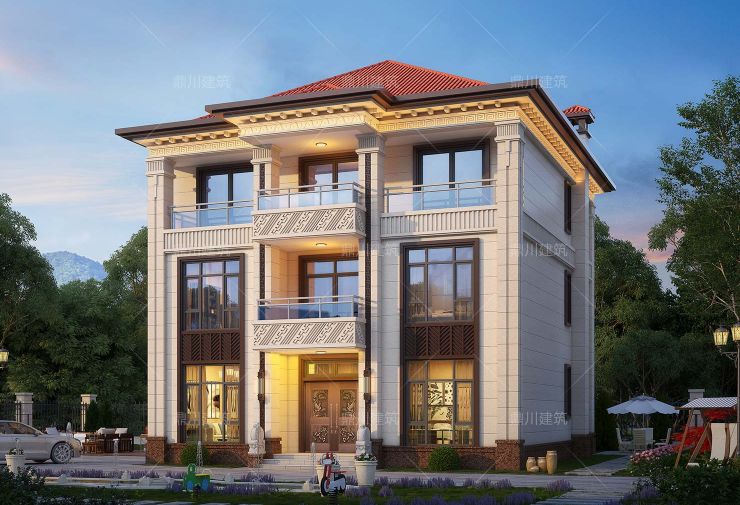 建筑整体采用新中式风格,造型上以门厅及双阳台的搭配强调立面层次感。窗框造型强调垂直线条感,增强立面延伸感,使得整体效果更显庄重大气。 新中式别墅最大的特点就是很有质感和格调,最简单的色彩搭配让别墅有了质的飞跃,大多数家里建别墅都是三层,一层主要是客厅厨房等,二层就是居住,三层来客人可以住,这在农村算比较普遍的建筑。