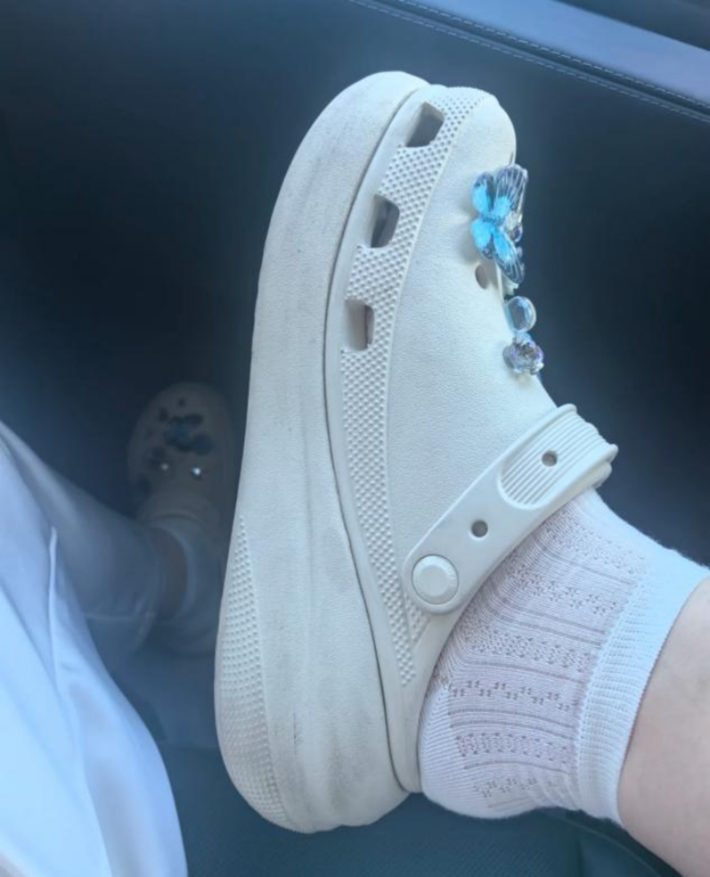 某天晚上,银行职员小颜在同事的推荐下,准备和老公去一家饭馆吃饭,她下班回家后换掉制服、皮鞋,穿上了新买的Crocs云朵,打算用4.2厘米的厚底,让自己显得更加挺拔。