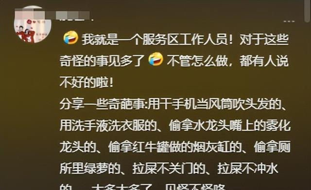 之后这名网友还在评论区分享一些司机在服务站高的奇葩事,像是用干手机当风筒吹头发的、用洗手液洗衣服的、偷拿水龙头嘴上的雾化龙头的、偷拿红牛罐做的烟灰缸的、偷拿厕所里绿萝的、拉屎不关门的、拉屎不冲水的……太多太多了