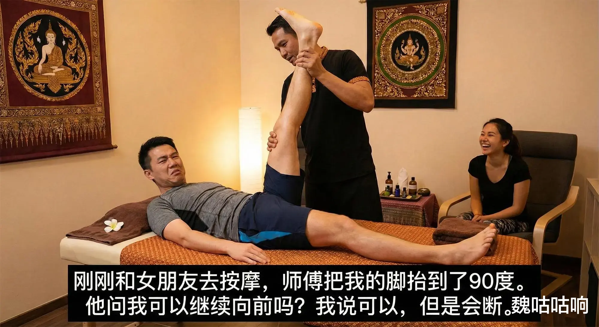“刚刚和女朋友去按摩,师傅把我的脚抬到了90度。他问我可以继续向前吗?我说可以,但是会断。”