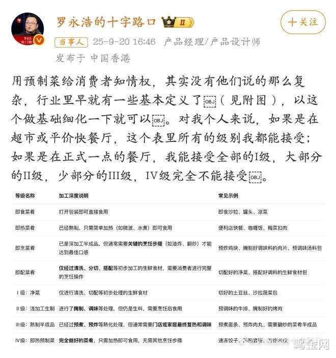 老罗贴出了一份有关预制菜的四大等级定义,比如清洗、切配等初处理的生鲜食材归为一级,这个大家都能接受。在正式餐厅里能接受大部分的二级和少数三级,即浅加工生制菜和熟制半成品。完全不能接受的是第四等级,也就是提前做好的即热预制菜。