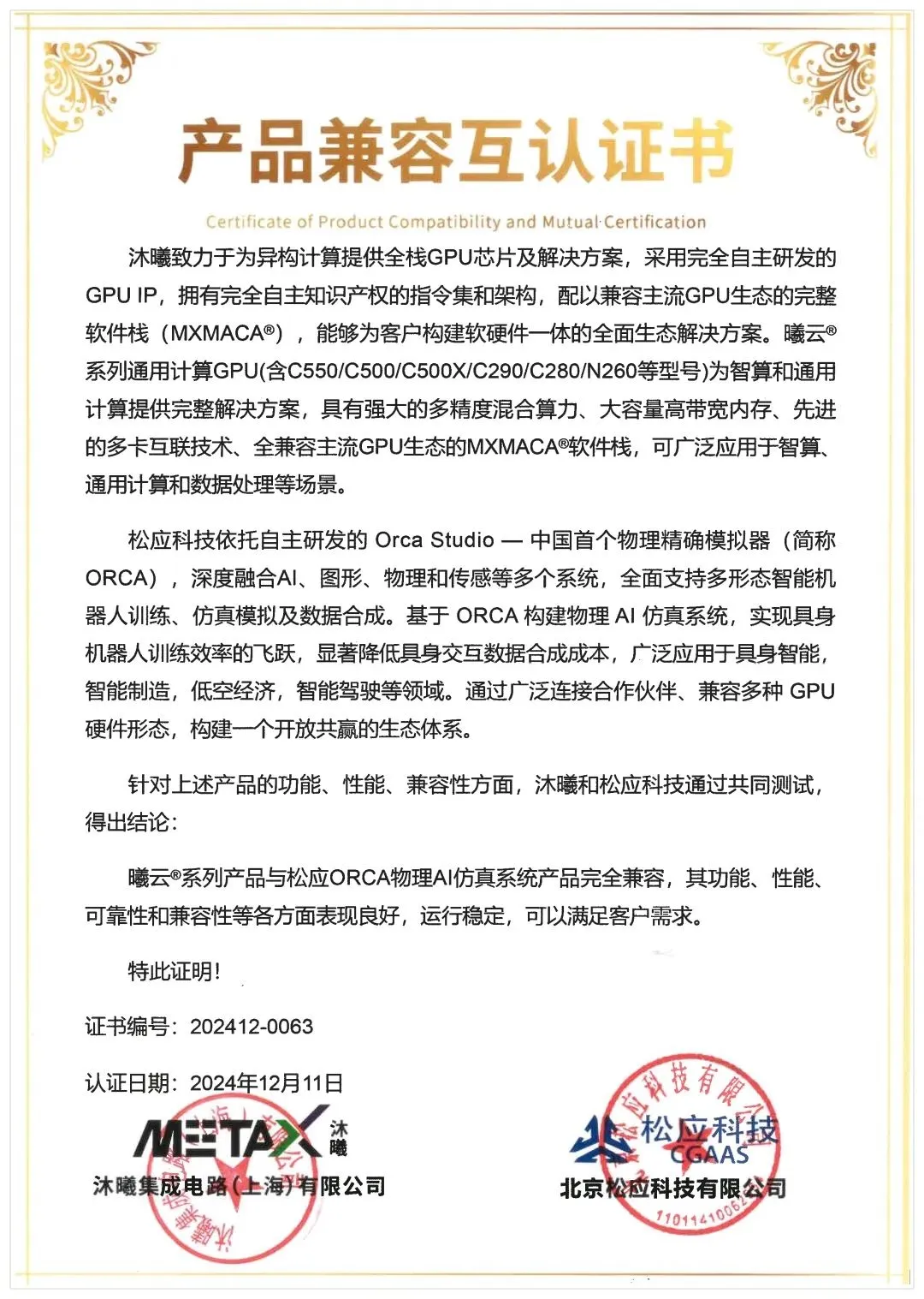 ORCA物理AI仿真系统与沐曦等GPU厂商完成兼容互认