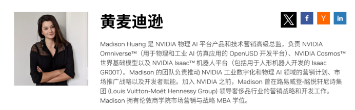 当外界还在紧盯着英伟达的GPU算力时,黄仁勋早已布局多年,悄悄落子。2020年,其女儿Madison Huang进入Omniverse部门,为宝马、奔驰等打造数字孪生工厂;2022年,儿子也投身机器人仿真平台Isaac Sim,参与推动亚马逊仓库自动化。一双儿女看似独立的职场选择,实则都在为同一个目标冲锋:拿下物理AI的未来。