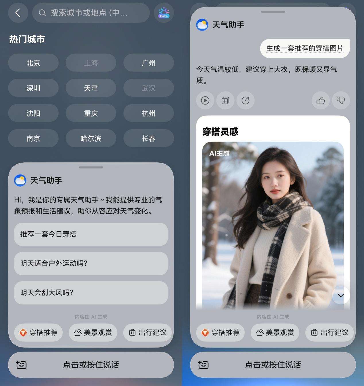 出发前,想到中午和晚上的温差我对着衣柜又犯了难。这时候点击App右上角的放大镜找到渐变色圆圈,唤起天气助手,可以直接让它“生成一套穿搭图片”。除了穿什么,适合户外运动吗、会刮大风吗、未来几天天气变化、对健康的影响等等都可以抛给天气助手,获取实用建议。
