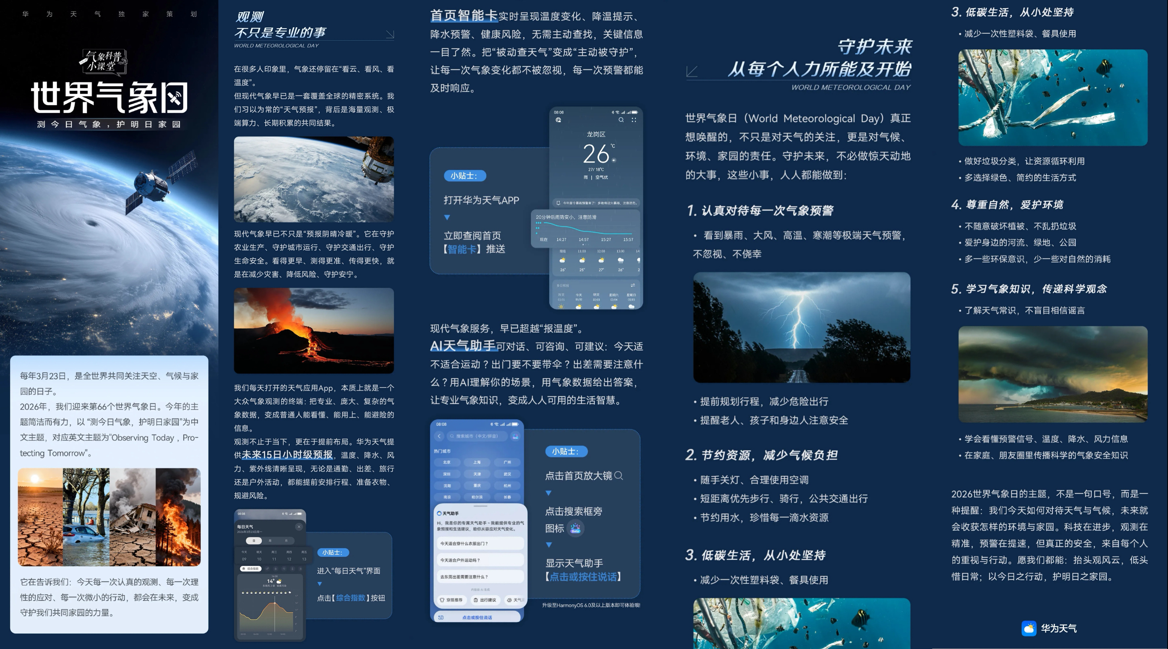 3月23日,是第66个世界气象日,主题“测今日气象,护明日家园”。今天看到华为天气上线的节日专题,我深有感触:气象就是日常的柴米油盐,是今天洗车会不会下雨,是周末的露营会不会变成“泥地求生”。关注每天的天气变化,过好每一个有准备的今天,不就是用实际行动守护我们自己的“小家园”嘛!