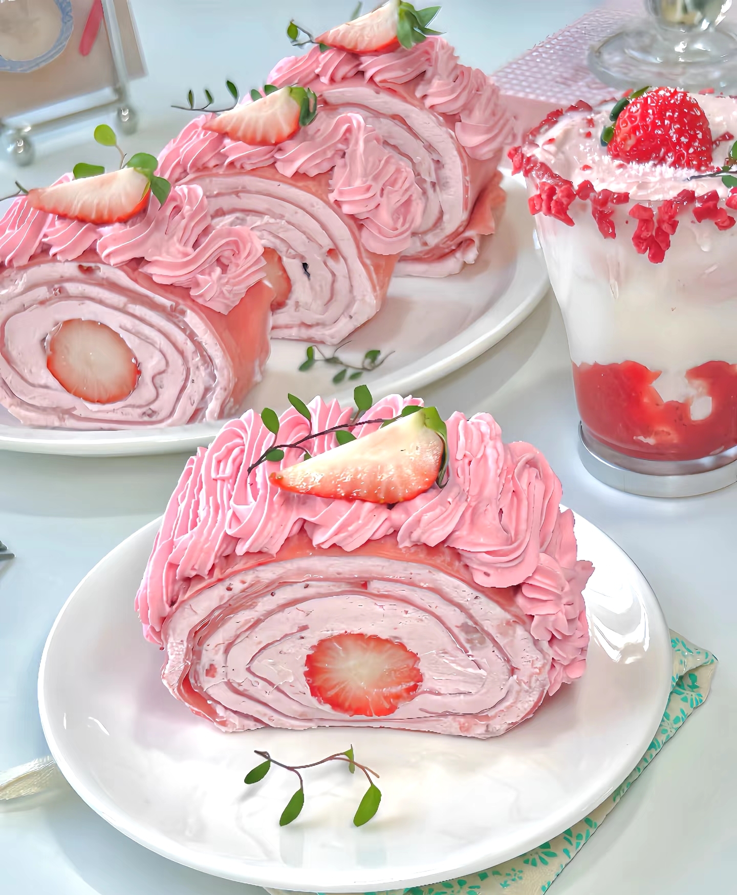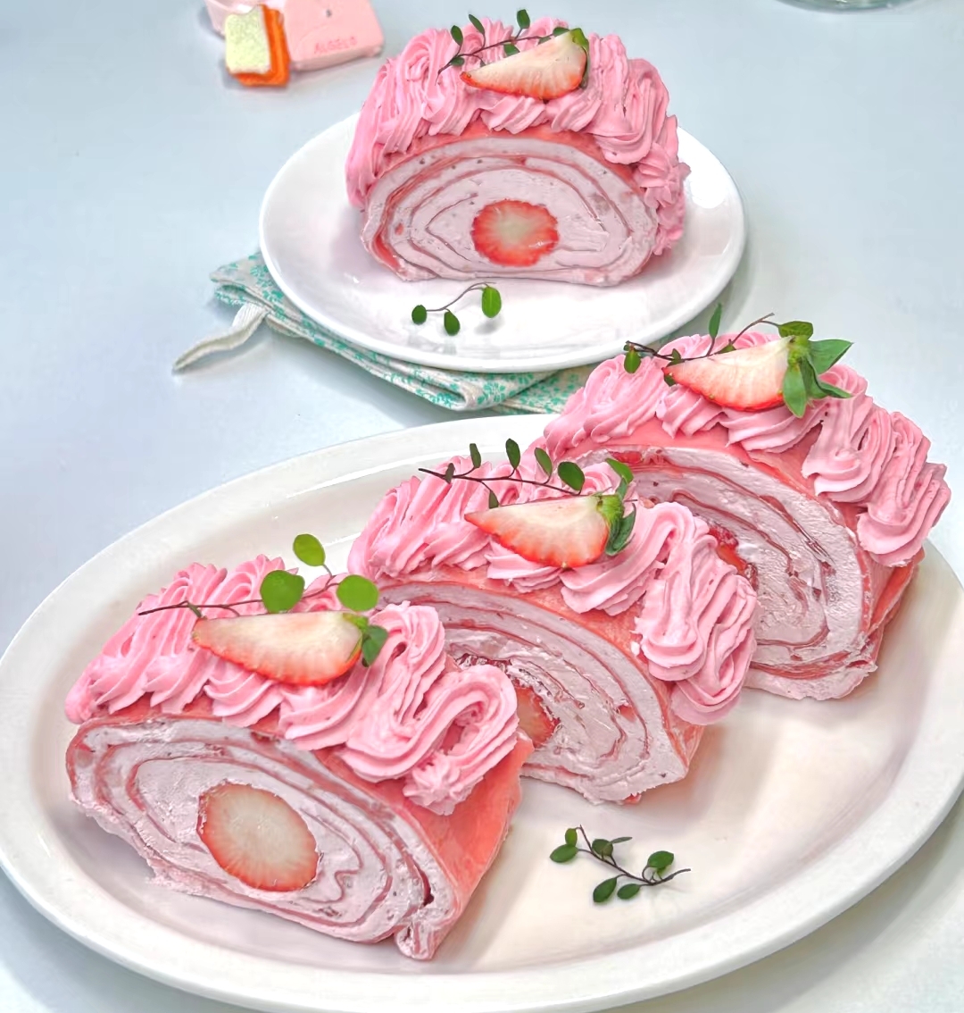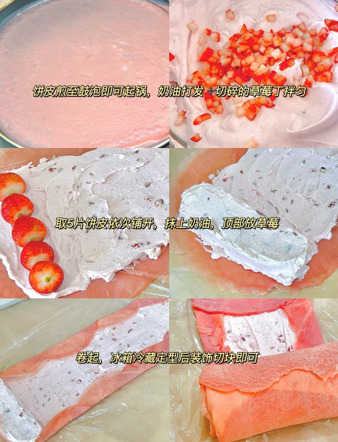 6.取5片饼皮依次铺开,抹上奶油,顶部放草莓,卷起来,冰箱冷藏定型后切块装饰即可