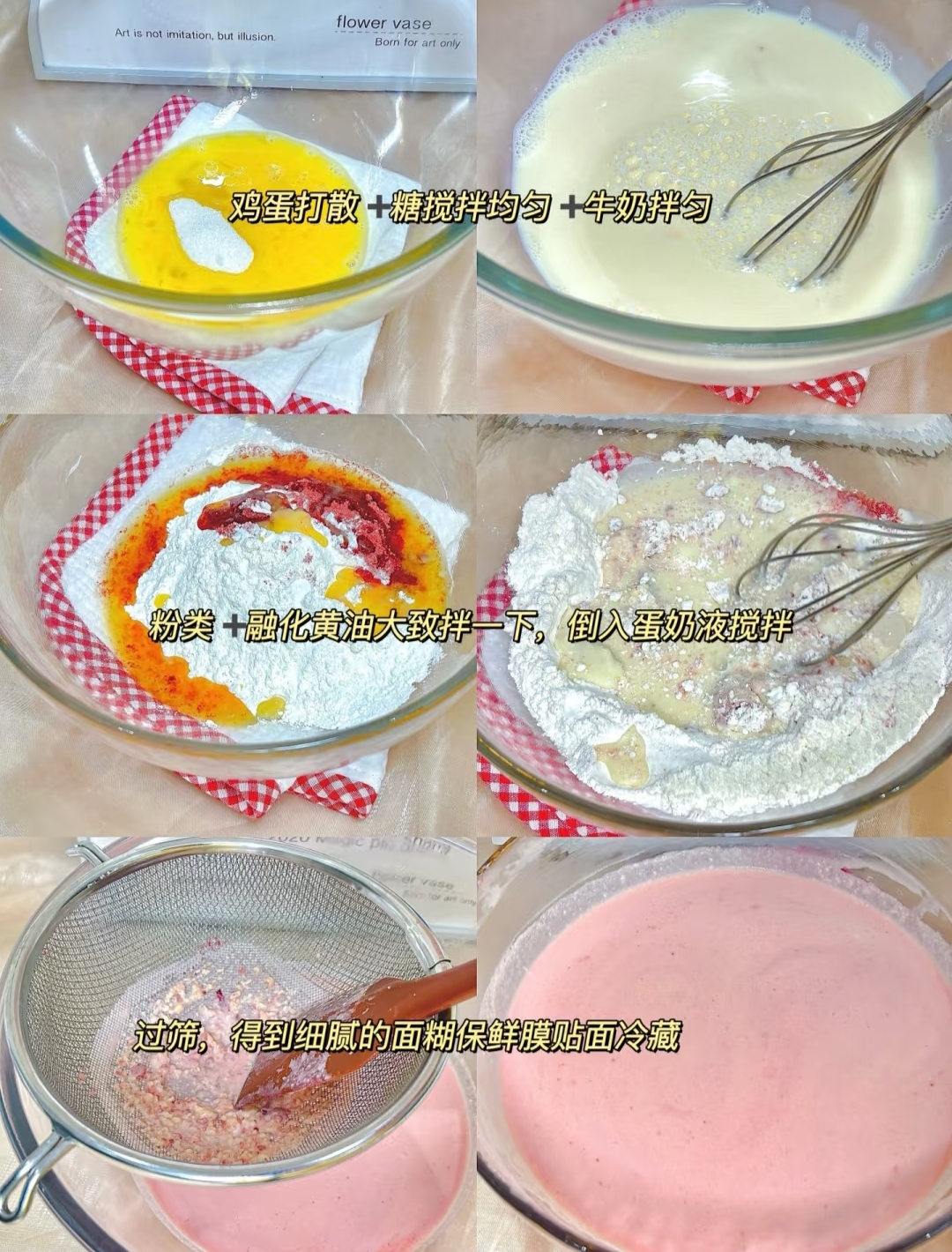 千层饼皮:2颗鸡蛋,细砂糖20g,低筋面粉95g,牛奶300g,黄油20g,草莓粉10g