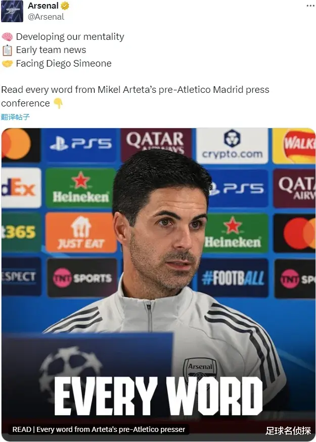 阿尔特塔出席了阿森纳对马竞的赛前新闻发布会,我们来简单看看伤病等问题。