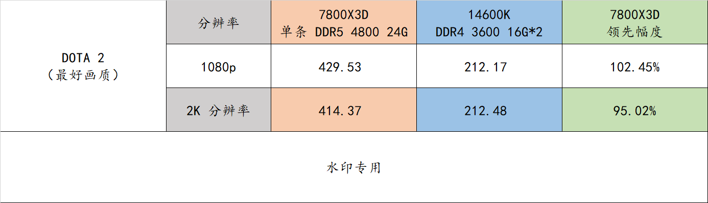 ▲ 实话实说,作为 X3D 系列最强的就是竞技网游类的表现,以《DOTA 2》为例,7800X3D + 单条 DDR5 4800 24G 直接秒杀 14600K + DDR4 3600 16G*2.