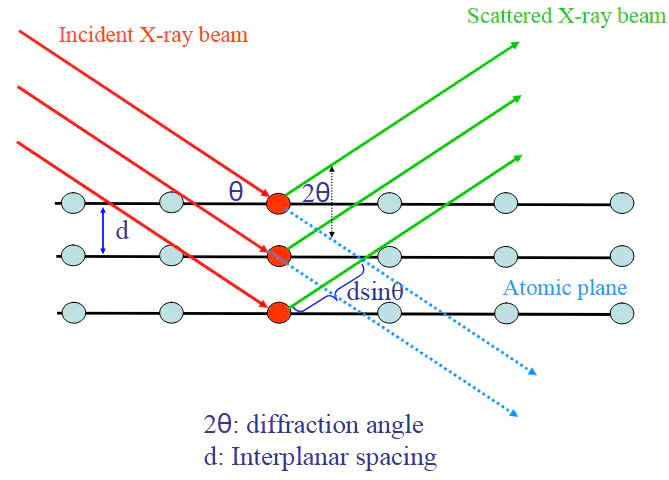 XRD技术能够测量层间距的物理基础是该定律描述了当一束单色X射线入射到晶体时,发生相长干涉(即产生衍射信号)所需满足的几何条件。其数学表达式为: