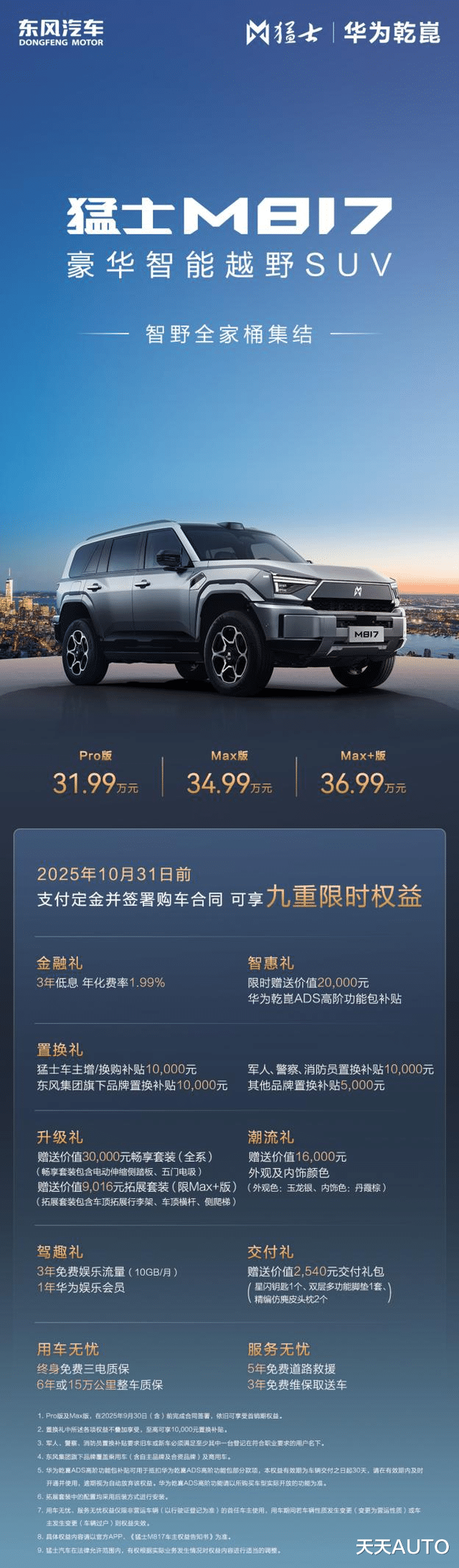新华AUTO:补全长续航关键拼图,智能越野体验再升级!9月29日,东风猛士科技与华为联手打造的豪华智能越野SUV猛士M817长续航新成员——猛士M817 Max+版正式上市,官方指导价36.99万元,10月31日前支付定金并签署购车合同,可享九重限时权益,轻松开启全域智野新体验。