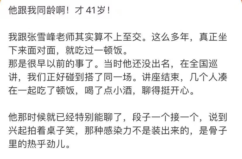 张雪峰离世,年仅41岁,跟他同岁的朋友发长文悼念他。朱伟也是做教育的,他说听到张雪峰去世的消息时,他整个人都不行了,根本就没办法再直播。当时他在直播,评论区很多人在问他知不知道这件事,朱伟一边直播一边打电话到张雪峰公司找人询问,当确认人没了后,朱伟关闭直播,泪流满面。