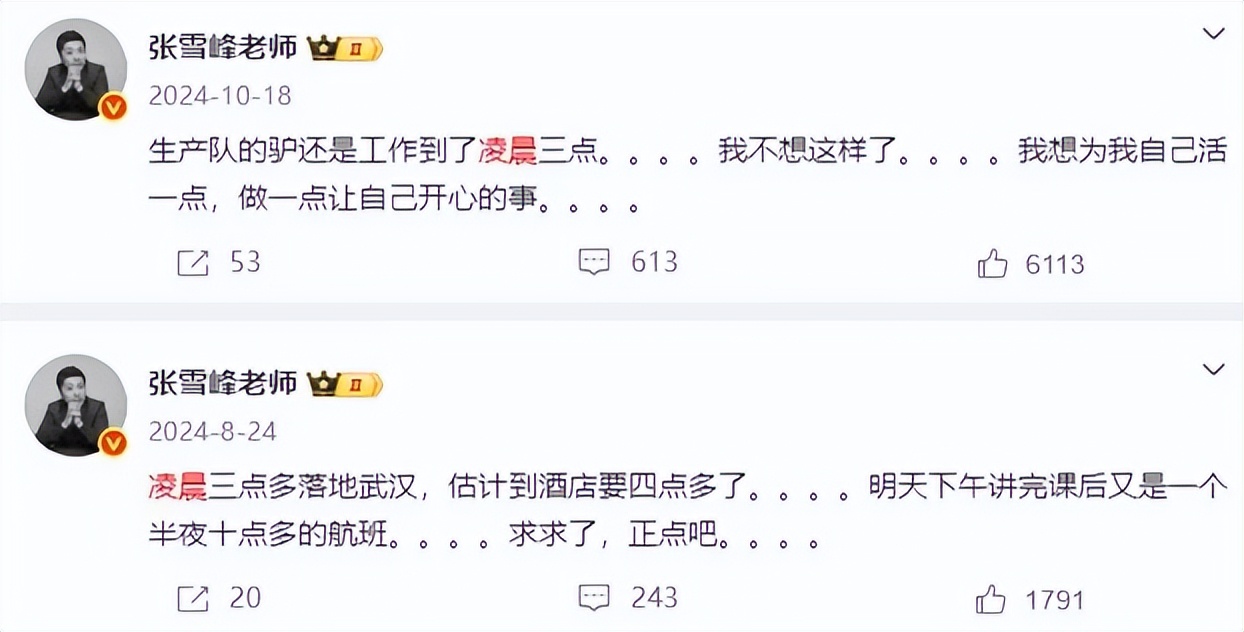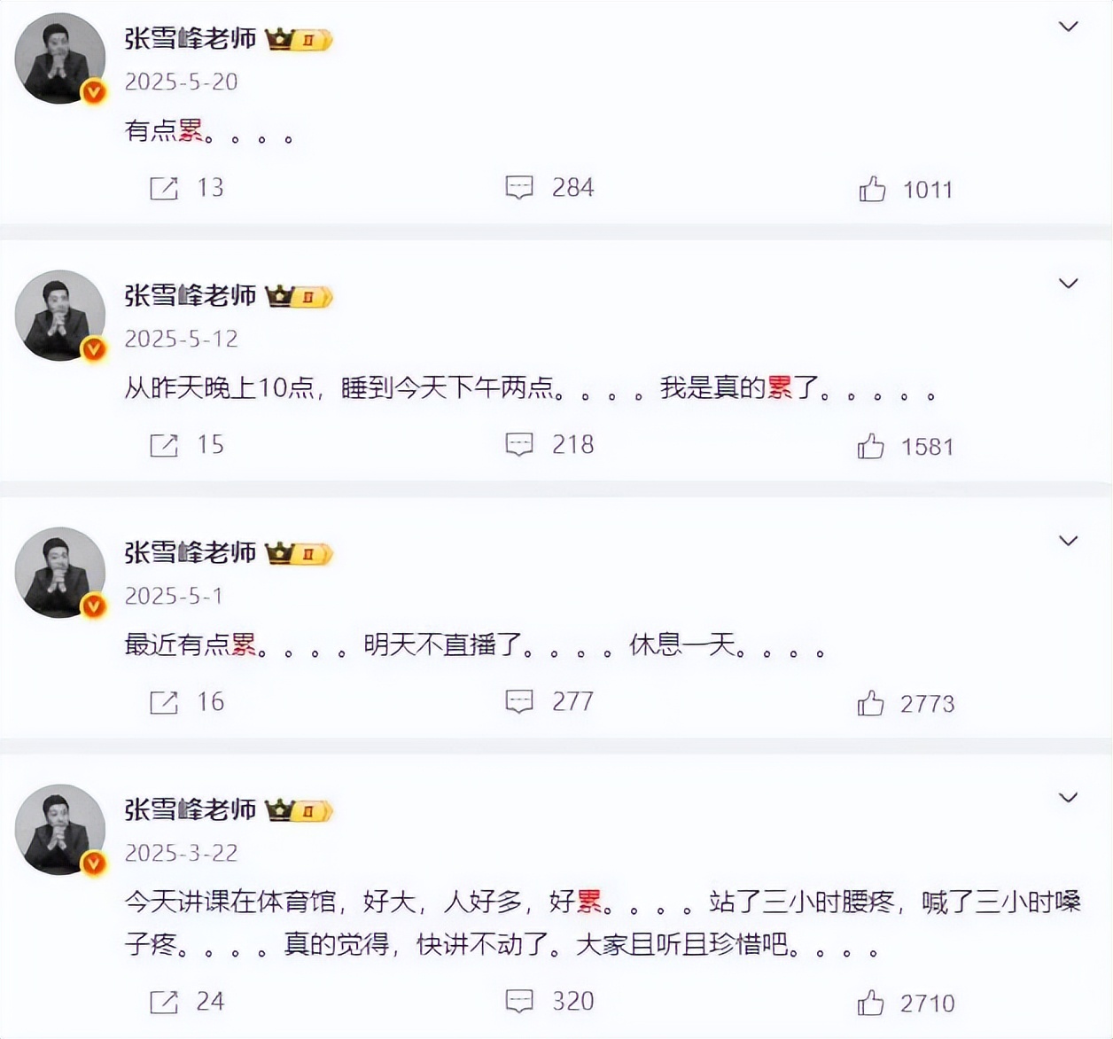 张雪峰为了给女儿好的生活,他一直在努力,微博被扒出九年时间里全都是高频词“累”和“凌晨”。在2024年张雪峰曾无数次发文说感觉自己不想这样过了,但他没办法停下来。2025年的五一是张雪峰难得的休息一天不直播,因为他实在太累了。