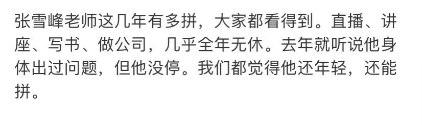 朱伟透露,张雪峰爆红后一直很拼,去年身体就出现过问题,但是他没有听劝停下来。这几年他都是几乎全年无休的在直播、讲课、写书、做公司。张雪峰自己也说过,他三十五岁时就已经有三家公司,上亿资产,但陪伴家人的时间几乎少之又少。