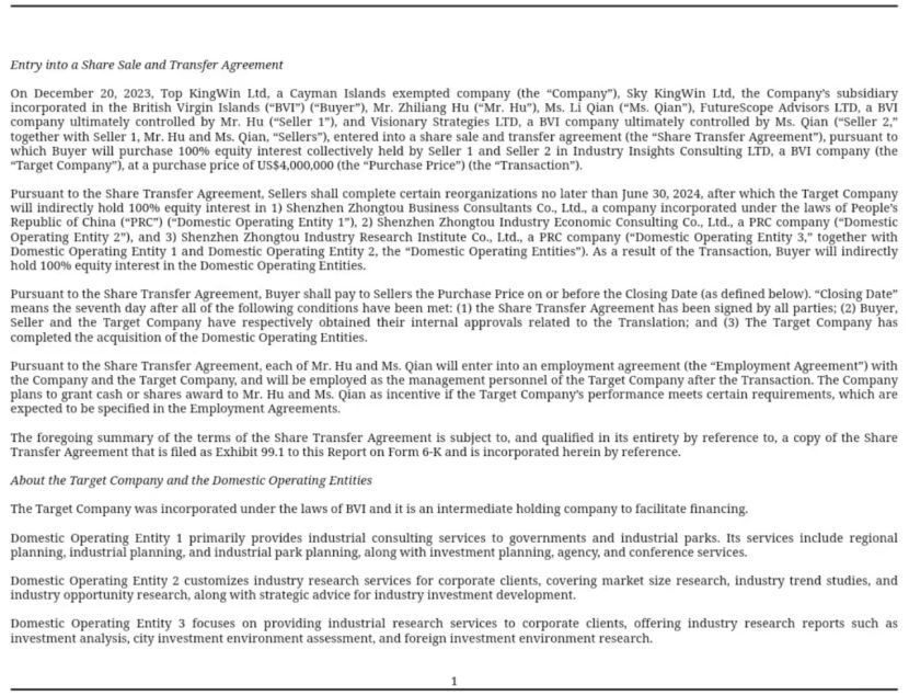 北京时间2023年12月21日,纳斯达克上市公司、被誉为“资本赋能第一股”的天成金汇(TCJH)发布公告称,将以400万美元的总对价全资收购深圳中投顾问旗下中投商业顾问、中投产业经济咨询、中投产业研究院等三家公司100%股份。本次交易完成后,三家公司将继续保持独立运营,天成金汇将为中投顾问提供全面的支持,为客户提供更好的服务。