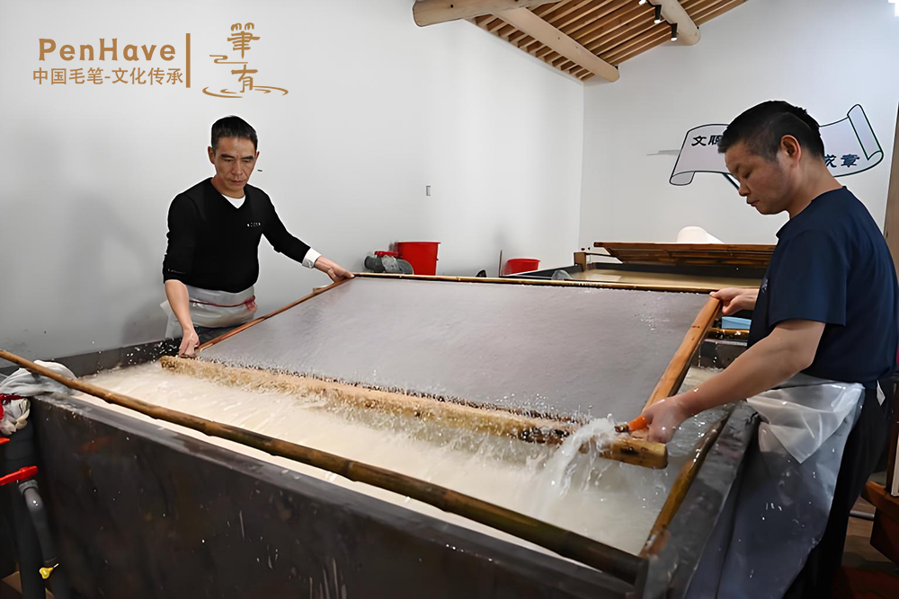 正宗宣纸以青檀树皮和沙田稻草为原料,经过浸泡、蒸煮、漂白、打浆、抄造、烘晒等108道工序,历时两年以上方能制成。泾县特有的山泉水呈弱碱性,有助于纤维的分散和纸张的成型。