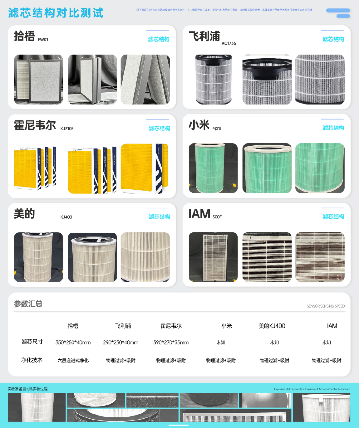 滤芯结构决定了空气净化器能否同时处理颗粒物和气态污染物。结构层级越多,说明能覆盖的污染物类型更广,净化深度更强。实验对比不同品牌滤芯的尺寸、层级和技术特点,从而评估它们在烟雾、粉尘以及TVOC等复合污染场景下的处理能力。