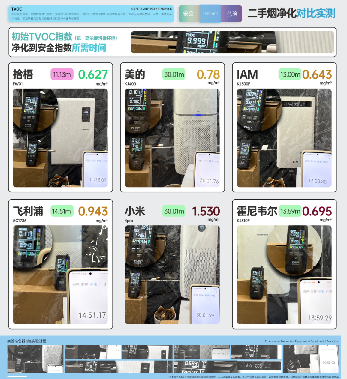 这些机型净化时间在13-15分钟之间,最终浓度维持在0.64-0.94 mg/m³,整体效果尚可,能满足普通家庭或轻度二手烟环境的使用需求,但在速度与深度上与拾梧存在差距。