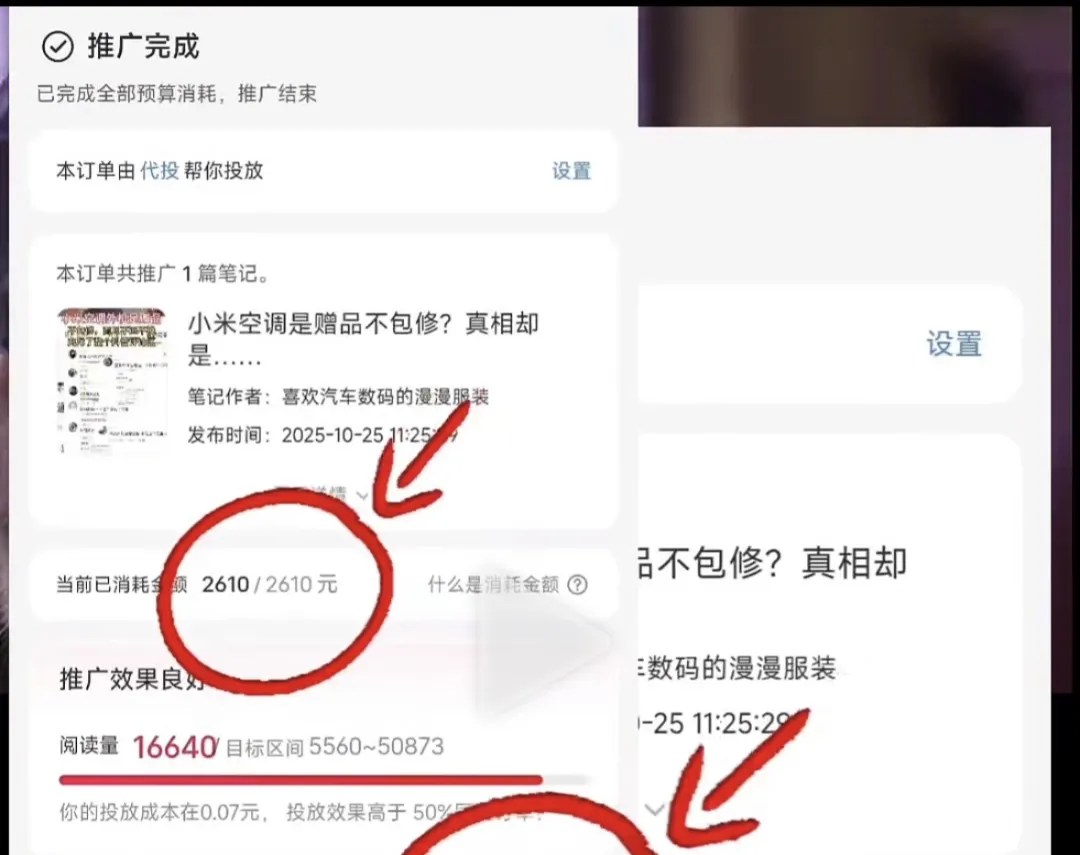 正要觉得自己的视频火了的时候,发现这条视频被陌生人投流了2610元,阅读量达到16640,截图显示,推广完成,本单由代投帮你投放。