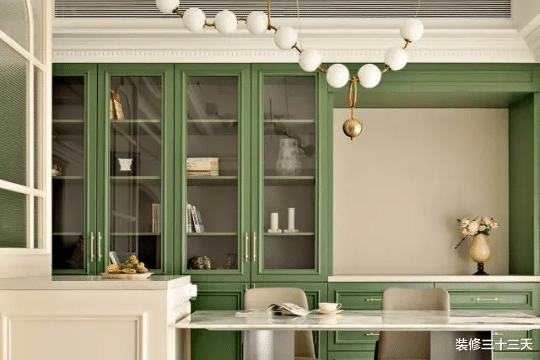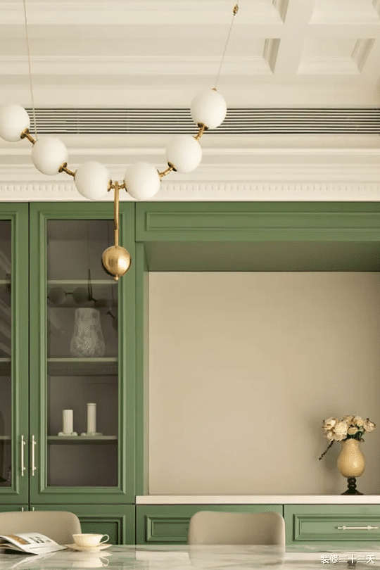 ▲ 餐厅背景一抹清新的翡翠绿,搭配纯白的餐桌、跳跃着的白色吊灯,用餐时光本身,也随之变得轻松活跃