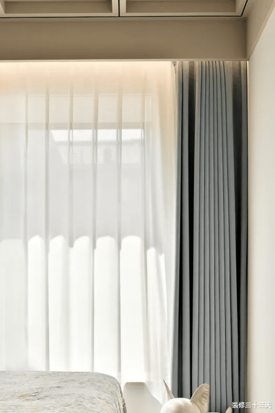 ▲ 次卧,格子结构吊顶凸显立体层次,使用浅咖米灰色与整屋氛围一致
