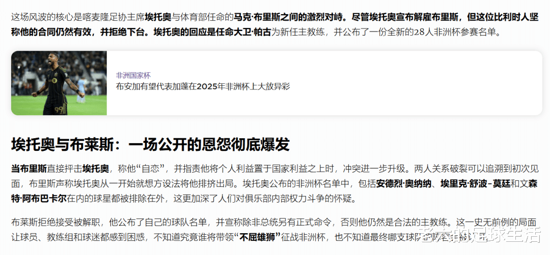 这份埃托奥公布的新大名单中奥纳纳、舒波莫廷、以及文森特·阿布巴卡尔等球星都被排除在外,布里斯直接公开指责埃托奥将个人利益置于国家队利益至上,两人的冲突也进一步升级。