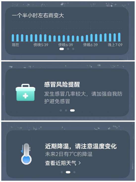 早上出发前,首页智能卡实时推送关键提醒。雨天能看到分钟级降雨预报,提前知晓雨势变化。换季降温时会收到降温预警、感冒风险提醒,提前做好保暖防护,躲开倒春寒的偷袭。
