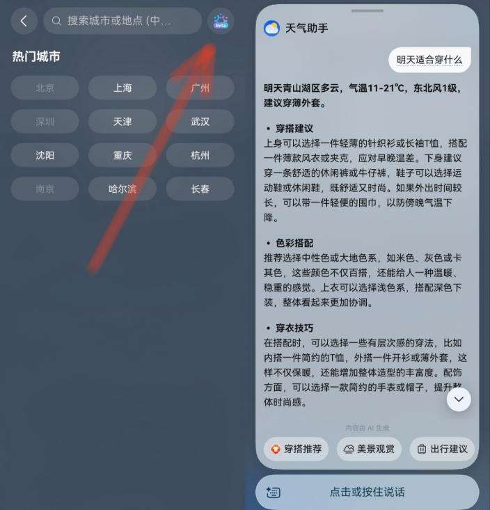 升级到HarmonyOS 6后,大家再去应用市场检查一下华为天气App版本,升级为15.0.14.300。再打开App,从首页右上角的“放大镜”进入“天气助手”。随时随地问一句通勤穿什么,就能收到适配当日天气和通勤场景的穿搭建议+色彩搭配+穿衣技巧等信息,轻松拥有春日OOTD。