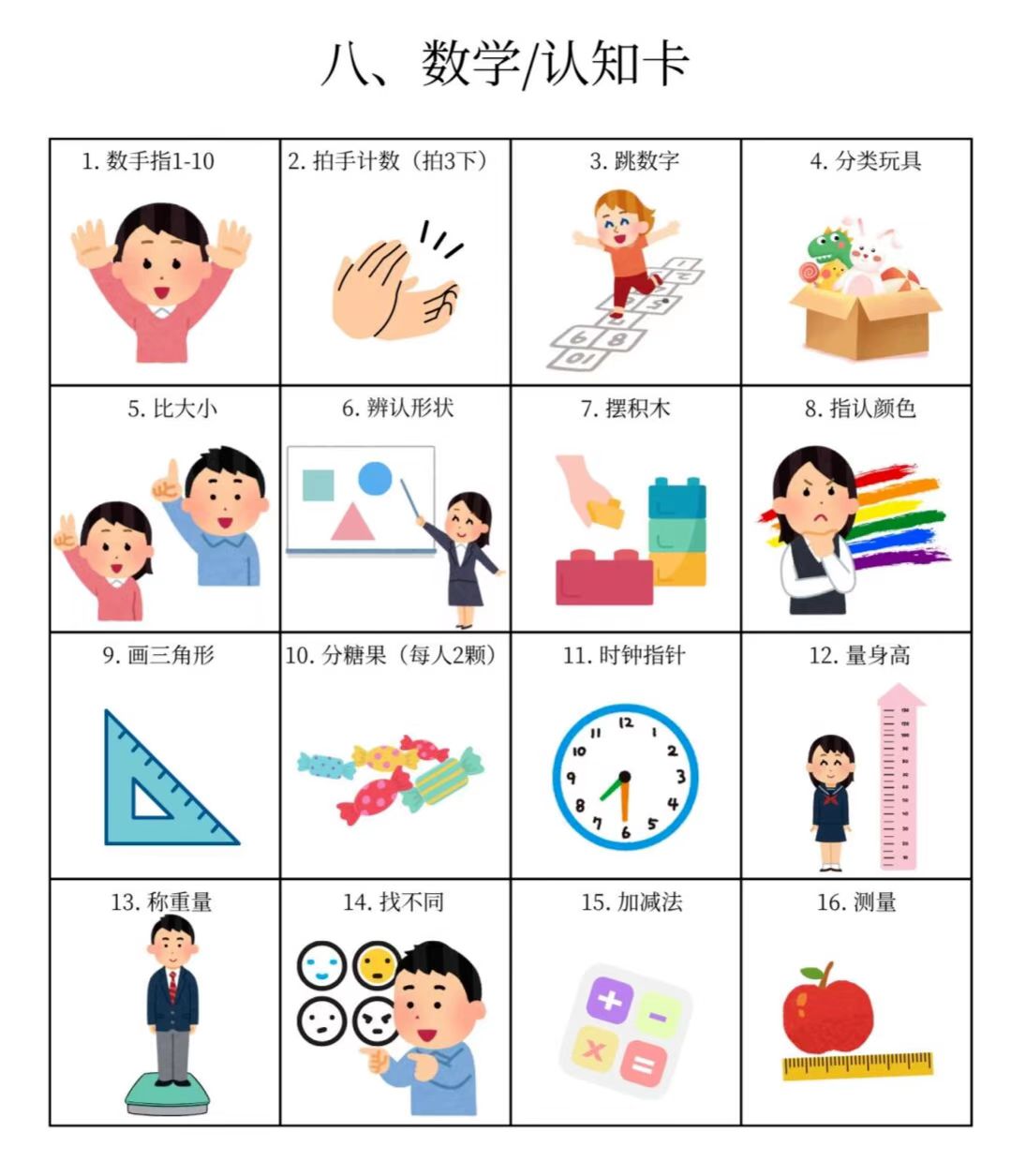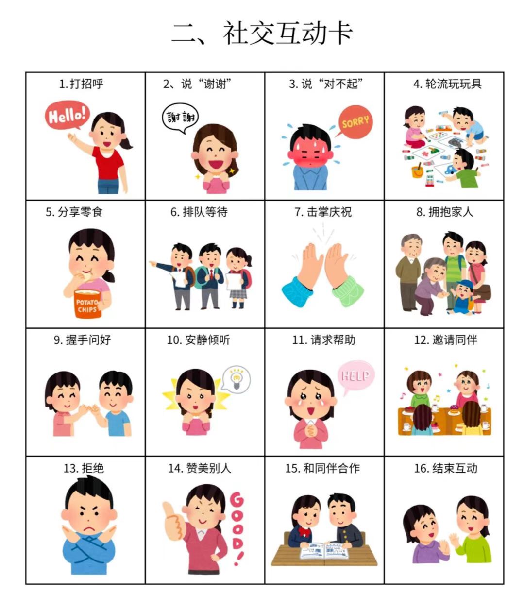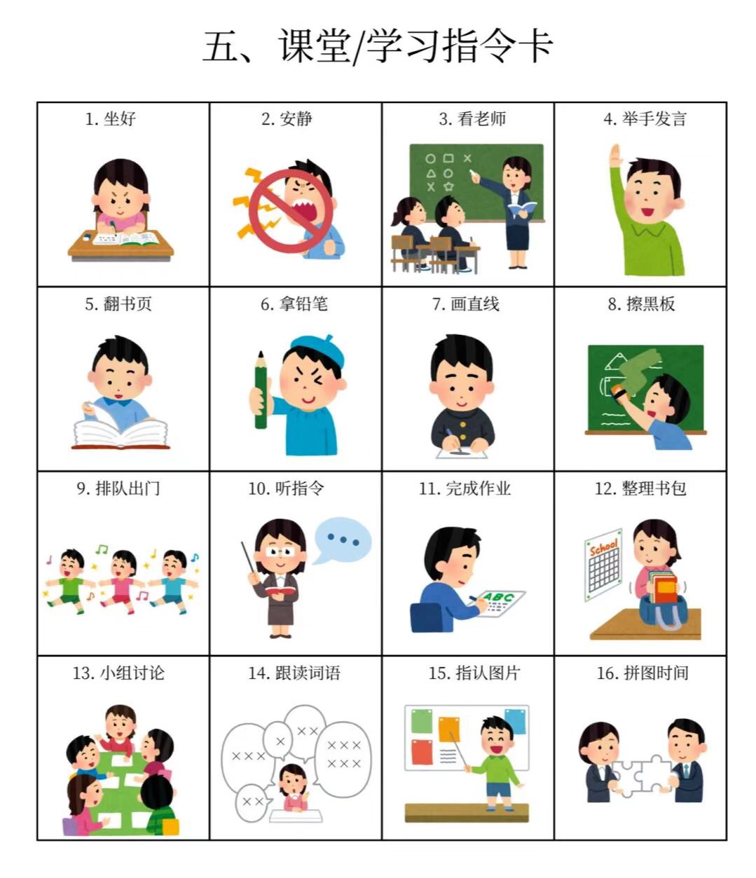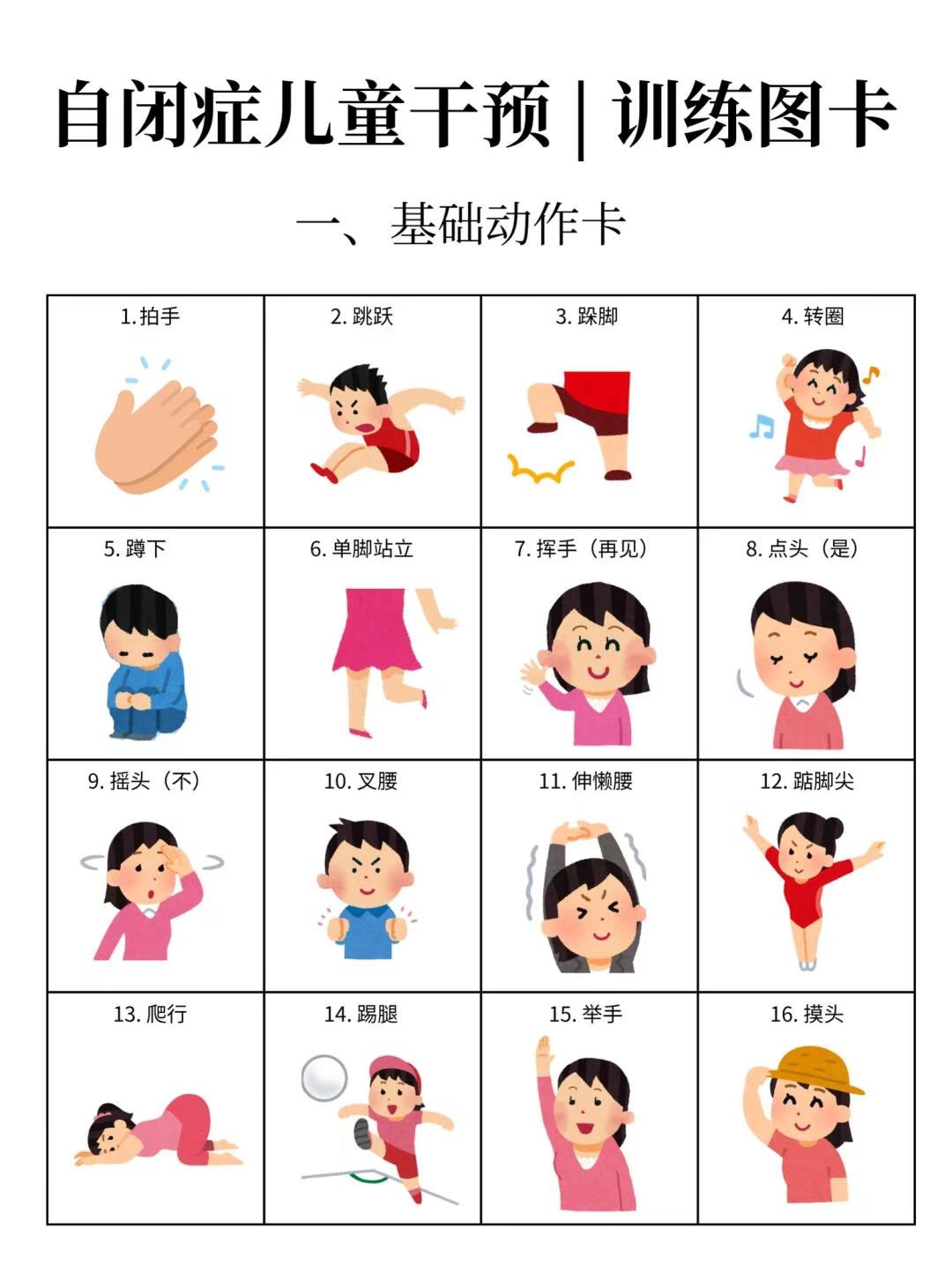我们整理了15个大类的「图卡训练」,包括基础动作训练卡、社交互动卡、情绪表达卡、生活常规卡、课堂学习指令卡等多个类型,涉及各个方面。