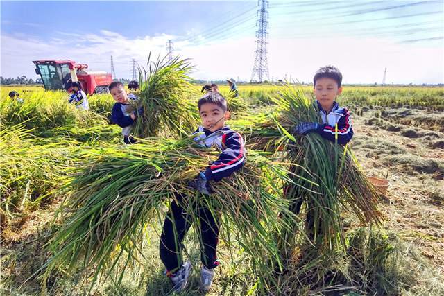 活动首日,学子们便沉浸于金色的稻浪之中。在农技师傅的指导下,他们手持镰刀,有模有样地学习收割水稻,体验“锄禾日当午”的辛劳与“秋收万颗子”的喜悦。随后,传统的打谷机成了最生动的教具,孩子们脚踏机器,看着谷粒在轰鸣声中欢脱脱落,丰收的成就感洋溢在每个人的脸上。