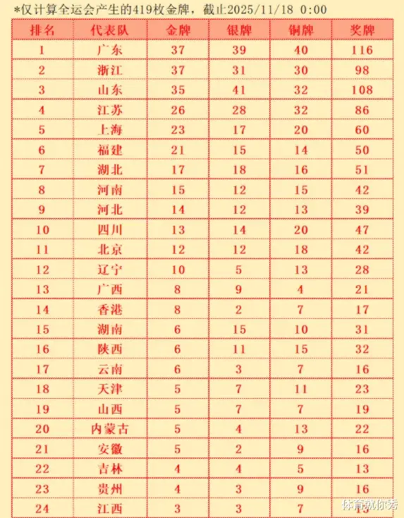 全运会在11月17日,也是结束了第9个比赛日的比赛,昨天也是产生了34枚金牌,其中在游泳项目中,一共产生了8枚金牌,浙江队成为最大的赢家,拿到了其中的4枚金牌,而在最新的金牌榜上,浙江队也是以37金的成绩,反超山东,占据金牌榜第2的位置。