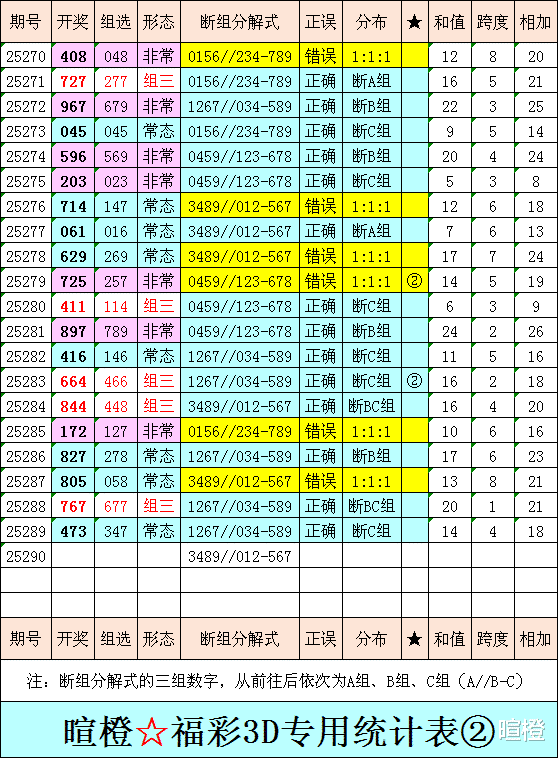 25290期:暄橙福彩3D综合条件(本期将在10月31日21:15开)一、上期回顾 ☆1、上期开奖号:4 7 3。2、和值= 14,跨度= 4。3、常态组六,011路组合。4、热度分布(热:温:冷)2:0:1。5、上期三胆有4,断C组。二、本期条件 ☆1、三期缺码:129。2、热:4678,温:2,冷:01359。3、断组分解式:3489//012-567。4、四胆:②③⑤⑧;三胆:②③⑧。5、近期适当关注热度(热:温:冷)1:1:1。****************①假定“热度(热:温:冷)1:1:1”成立,得出20注组选:024,026,027,028,124,126,127,128,234,236,237,238,245,249,256,257,258,269,279,289。****************三、术语解释 ☆1、三期缺码:0至9这十个自然数当中,未在近三期开奖号出现的数字。2、热度(热温冷):自然数0至9,在近七期开奖号中,出现3次及3次以上的数字,称为热码;出现2次的数字,称为温码;出现1次和未出现的数字,称为冷码。某个数字在开奖号中出现几个,就按几次计算。3、断组分解式:将0至9这十个自然数,分成三组数字,从前往后依次为A组(4码)、B组(3码)、C组(3码),一般情况下,有一组数字不出码,偶尔会有两组数字不出码。A组不出码的情况相对较少。断组为主,分解为辅。4、常态组六号码:同时包含大数、小数、奇数、偶数、质数、合数的组六号码,共有72注。统计表中,简称“常态”。5、非常态组六号码:全大数、全小数、全奇数、全偶数、全质数、全合数等六种形态的组六号码,共有48注。统计表中,简称“非常”。★提醒:彩市有风险,参与须谨慎!理性购彩,量力而行!多看少买,不要痴迷!任何条件都有出错的时候!水平有限,仅供参考!友好互动,好运相伴!