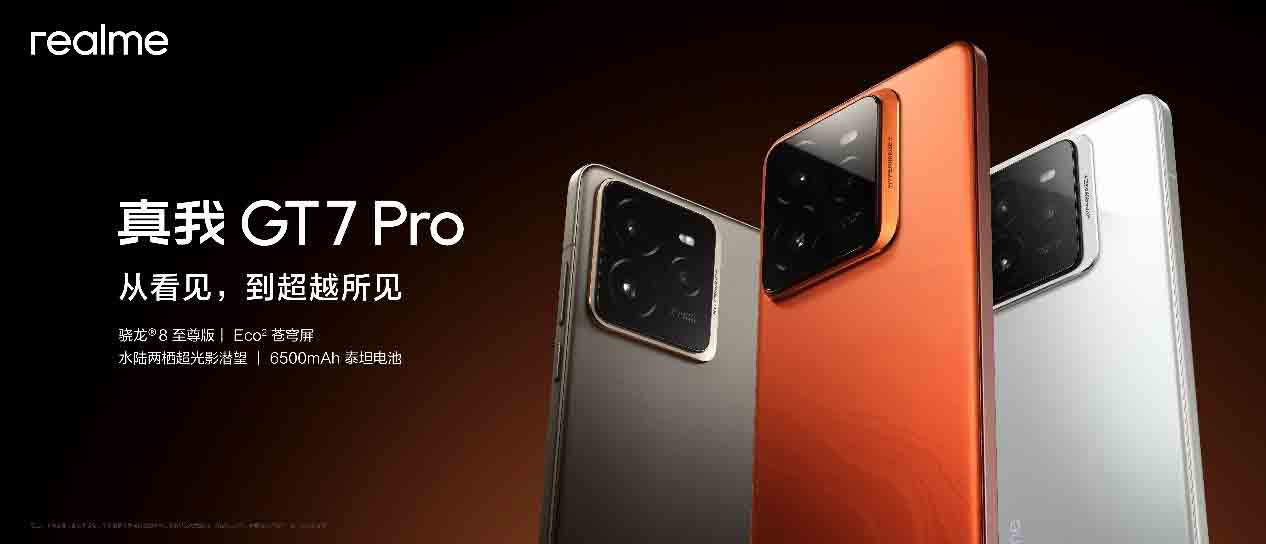 2024年11月4日—中国 · 深圳—真我举办新品发布会,正式推出新一代“双擎旗舰”——真我GT7 Pro。作为真我有史以来最强大的GT旗舰,真我GT7 Pro搭载骁龙8至尊版、50MP超光影潜望长焦、三星定制Eco²苍穹屏、行业唯一6500mAh+120W续航灭霸组合,是当之无愧的骁龙8至尊版质价比之王!真我GT7 Pro将于11月11日10点在全渠道正式开售,12GB+256GB首销限时价仅需3599元,12GB+ 512GB版本售价仅需3999元。