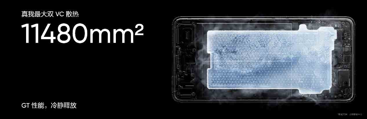 强大的性能释放离不开强大的散热保驾护航。真我GT7 Pro搭载真我史上最大双层散热VC,总面积高达11480mm²,散热效率明显加强,在35度环境2小时游戏测试中,帧率稳定性、温控表现全面超越iPhone。