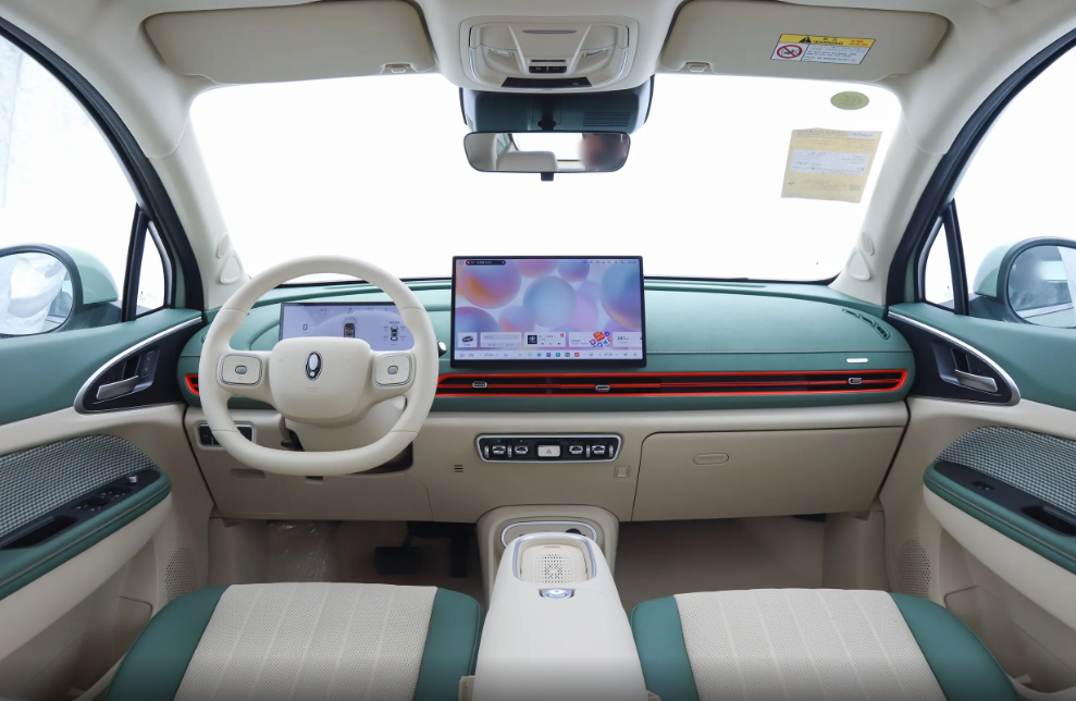 相比简约但不失精致感的外观设计,欧拉好猫的内饰看起来更加时尚一些。这款车型为用户提供了双拼色内饰(非标配),搭配简洁的中控台,符合当代年轻消费者的审美喜好。大尺寸的悬浮式中控屏,为它增添了一些科技感。中控屏下方的位置,欧拉好猫还保留了一些金属按键,看起来精致感挺强。需要一提的是,比起市面上的竞争对手,欧拉好猫虽然也是采用较为常规的T型中控台,但是它的中控台分为上下两层,上层是手机槽、扶手箱,下层是水杯架,看起来也比较有趣,能让消费者得到一些新鲜感。