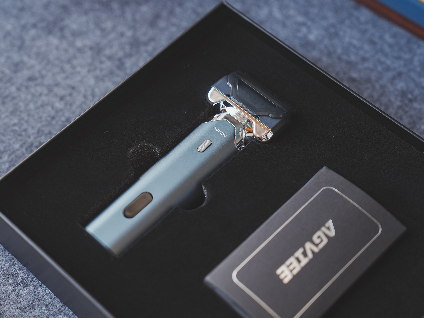 盒子整体为黑色,正面为“AGVIEE”的英文标识以及盒子中央的MRX剃须刀产品简图。